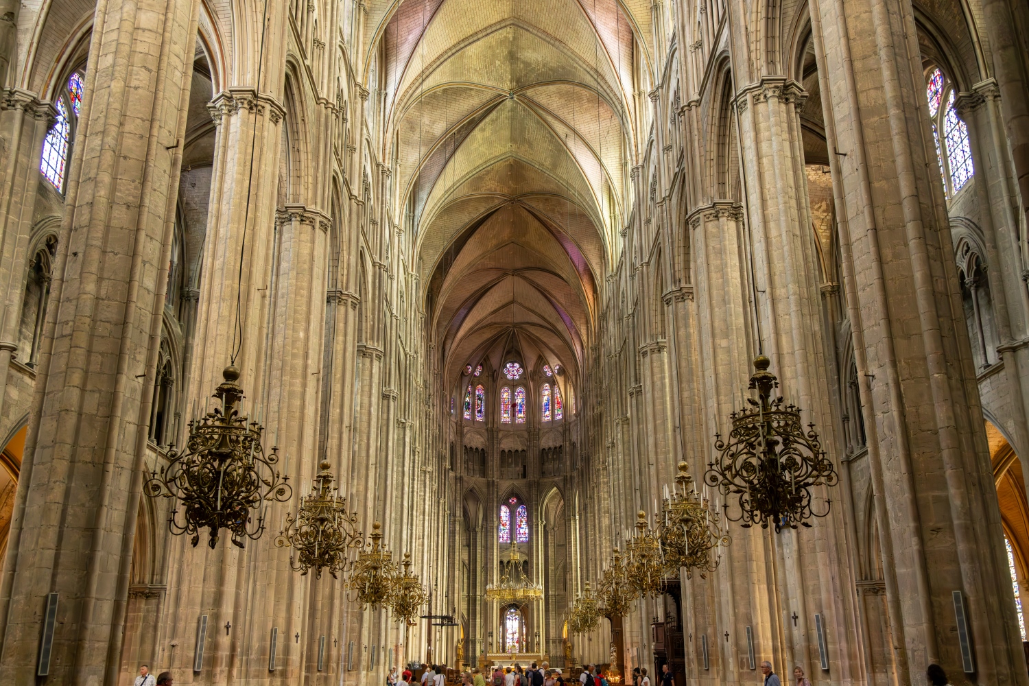 設計はシンプルで調和が取れていて、五つの身廊と聖歌隊を囲む礼拝堂を持つバシリカ式の構造になっています。二重のフライング・バットレスによって、トリビューン(上階席)が不要となり、身廊と側廊全体に均等な光が差し込むようになっています。この大聖堂の最も注目すべき特徴は、側壁の遠近感と内部空間の統一性。西正面中央の「最後の審判」のタンパンや、北・南の扉の彫刻、そして彫刻された聖障などは、ゴシック美術の傑出した例です。さらに、14〜16世紀にかけて加えられたステンドグラスは、まるでその時代の美術を網羅した百科事典のような存在です。