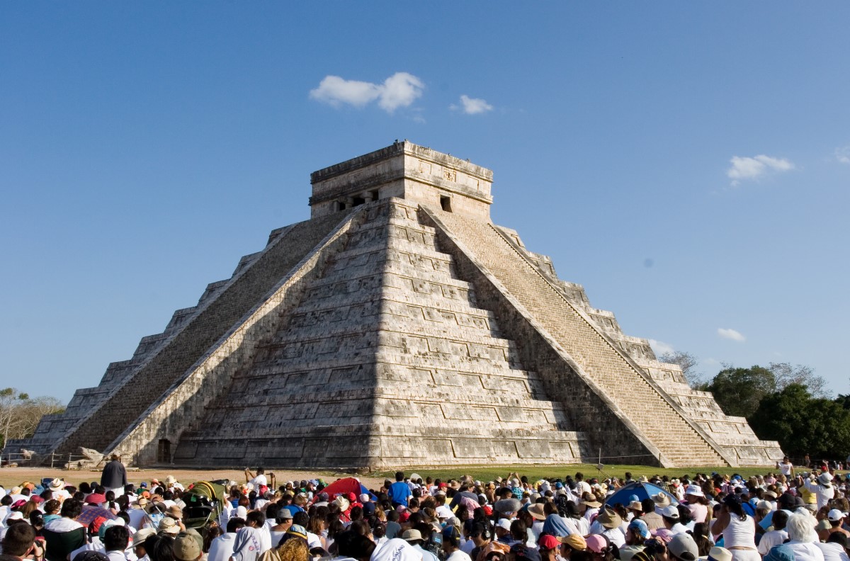 エル・カスティーリョは新チチェンにある9層の階段状のピラミッドです。階段は365段で一年が表現されていると考えられ、ピラミッドの最上部にはククルカン(ケツァルコアトル)神殿が建てられています。春分と秋分の日には階段の欄干に三角形をつなぎ合わせたようなジグザグの影ができ、蛇に羽毛が生えたとされるククルカンを表現しているように見え、「ククルカンの降臨」と呼ばれています。また調査によりエル・カスティーリョの下にセノーテがあることもわかっています。
