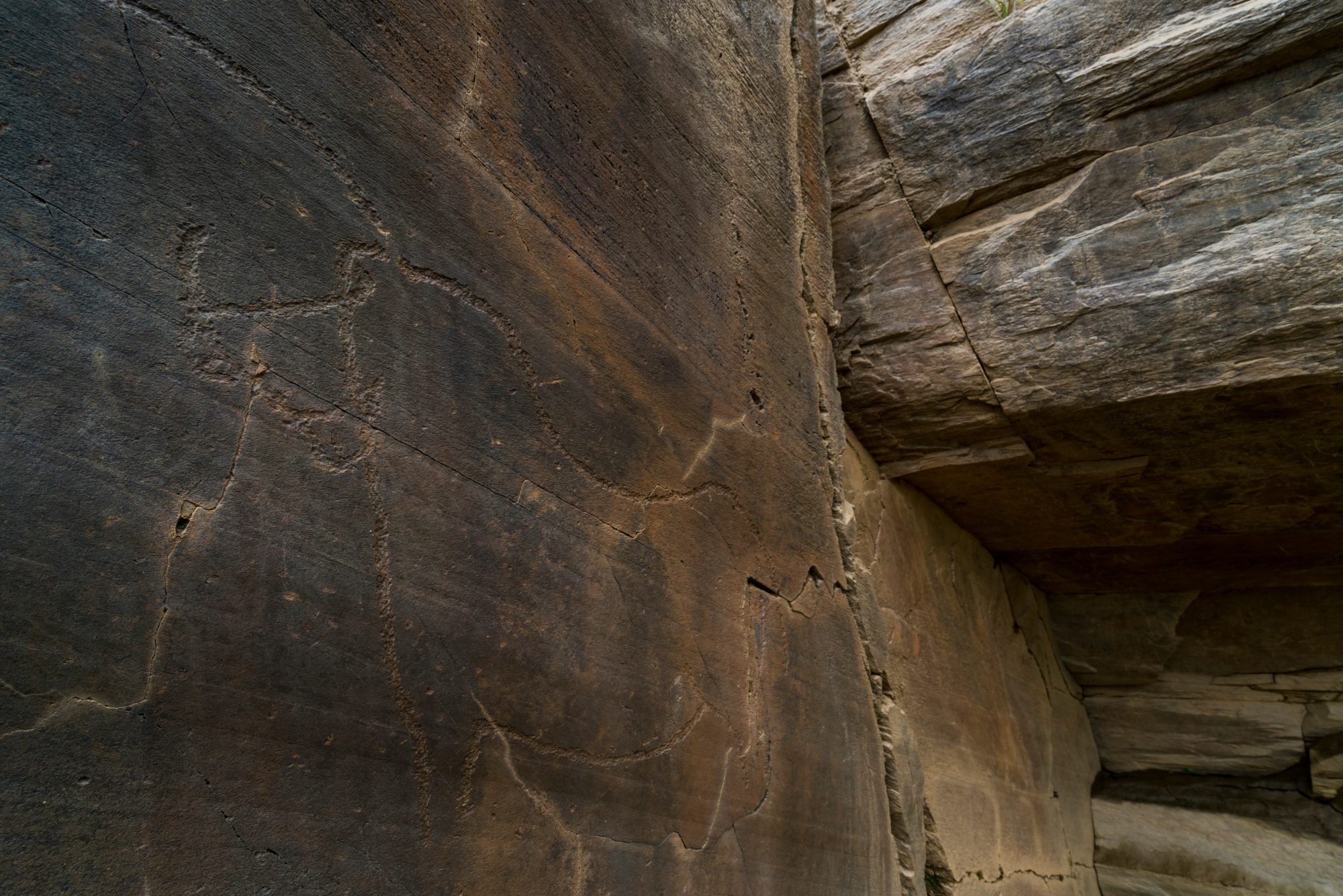 コア渓谷のリベイラ・デ・ピスコス。石器で岩の表面を削り、点や線で動物などが描かれた