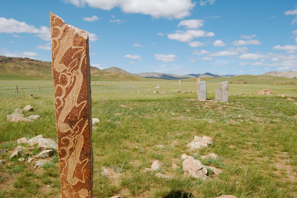 モンゴル中央部のハンガイ山脈の周辺には、紀元前1,200~前600年頃に建造されたと考えられる鹿石と呼ばれる巨石記念物とその周辺の祭祀跡からなる複合的な記念碑があります。ユーラシアの草原地帯では約1,500基もの鹿石が発見されており、その80%以上がモンゴルで発見されています。鹿石は概ね3つのタイプに分類されますが、そのうちのモンゴルタイプに分類されるものは様式化された牡鹿の像が刻まれているのが特徴で、大きなものは高さ4mにも及びます。このうち、世界遺産にはホイド・タミール、ジャルガランティン・アム、ウルティン・ヴラグ、オーシギーン・ウブルの4つの遺跡が登録されています。主として、鹿石、ヘレクスル(中央の丸い石塚と周辺の円形もしくは方形の石囲いを持つ積石塚)、生け贄の祭壇、人や馬の骨などで構成されており、いずれも後期青銅器時代の遊牧民族の葬送文化を知る上で貴重な遺跡とされています。