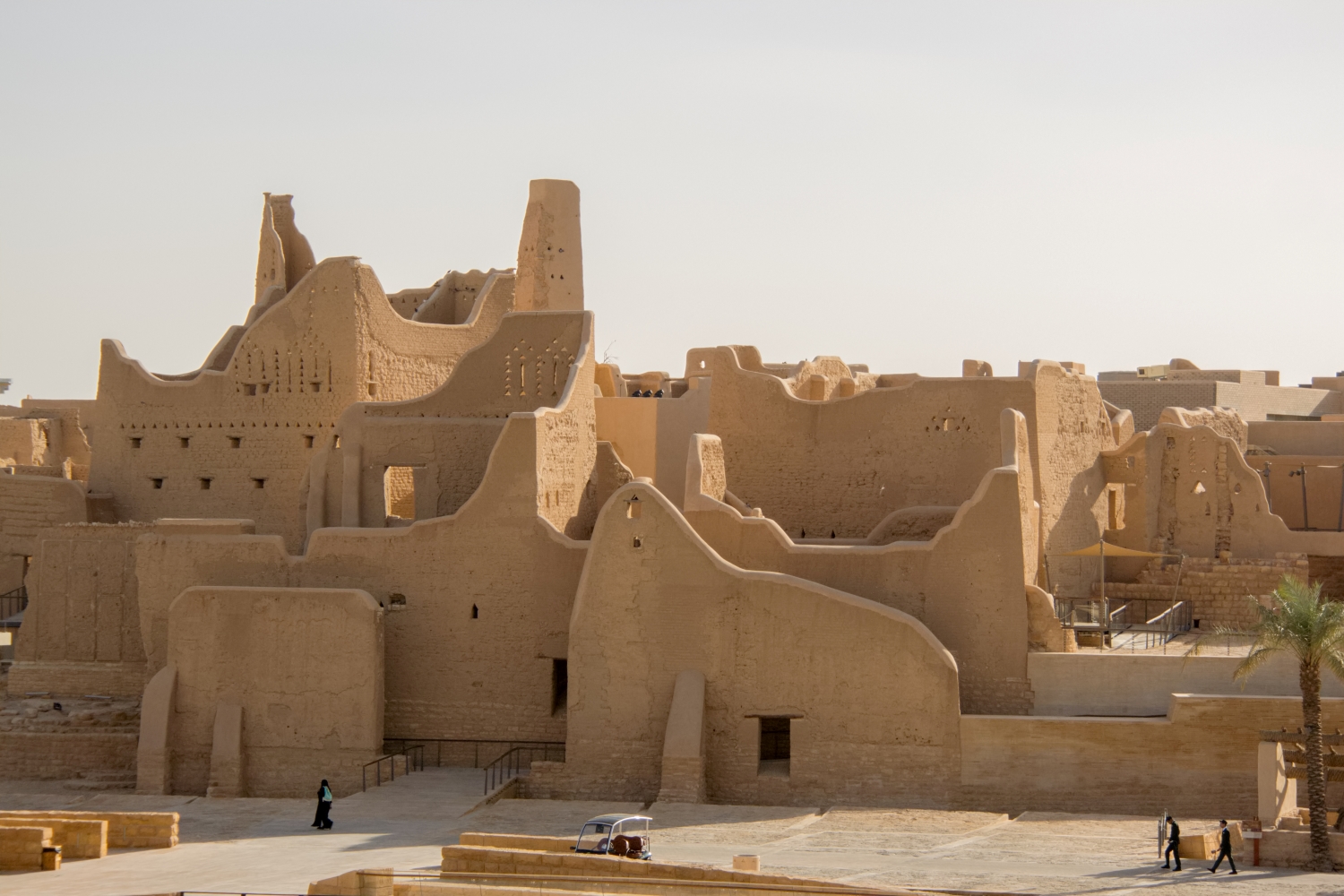 サウジアラビアの首都リヤドの北西に位置するディライーヤは、アラビア半島に存在したサウード朝の最初の首都でした。15世紀に築かれたツライフ地区は、アラビア半島中心部特有のナジャディ様式の建築様式を今に伝えてくれています。ナジャディ様式とは、砂漠という環境に適合するために、日干しレンガやヤシの木を利用し、三角形の開口部を設けたアラビア半島のオアシス独特の建築様式のことです。多くの建物が廃墟になってしまっているものの、ほとんど構成要素の大部分が現存しており、急激な近代化の開発を免れていたため、保存状態も良好です。