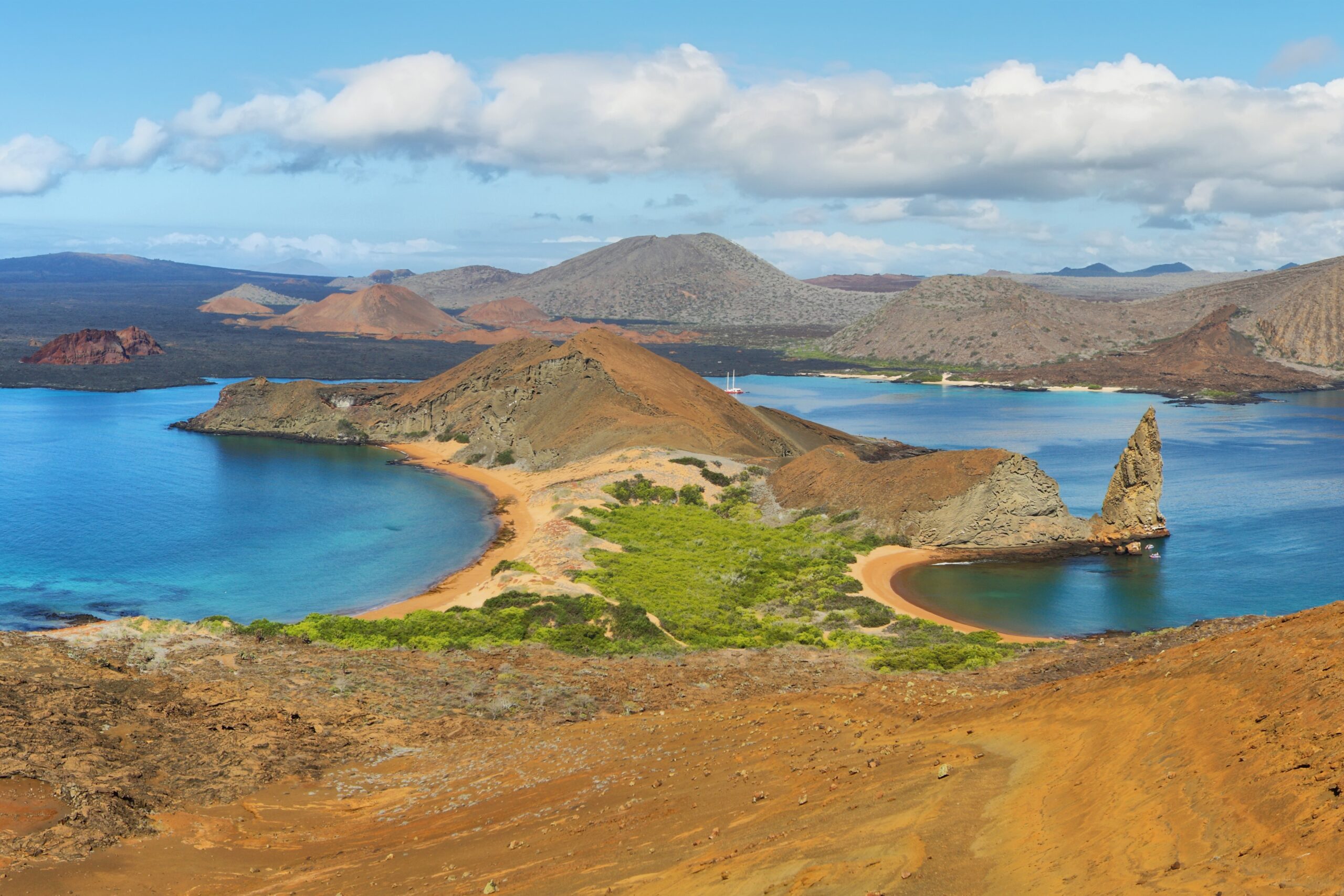 ガラパゴス諸島は、南米のエクアドル本土から西に約1,000km、赤道直下の東太平洋沖に位置しています。大小19の島と周辺の岩礁からなるガラパゴス諸島は、海底火山の噴火によって誕生した島で、これまでに一度も大陸と陸続きになったことがない海洋島です。動植物は隔絶された島の環境に適応し、独自の進化を遂げていきました。現在、ガラパゴス諸島の陸地の97%は保護地区となっており、サンタ・クルス、イサベラ、サン・クリストバル、フロレアナの4つの島を除き、人は住んでいません。