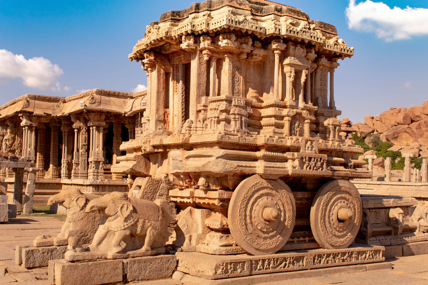 インド南部のハンピには、14~16世紀にかけて南インドを支配した最後のヒンドゥー教王国ヴィジャヤナガル王国(「勝利の都」という意味)の都市遺跡があります。この都市は7重の城壁を巡らせた堅固な要塞都市であったとされ、約26㎢の範囲に王宮や寺院、バザールなどが建ち並んでいました。しかし1565年にイスラム勢力によって蹂躙され放棄されました。現在残っているのは、最も神聖な聖域とされる「ヴィルーパークシャ寺院」と、石造りのラタ(山車)が有名な「ヴィッタラ寺院」などです。これらの寺院は、当時王国で広まっていたドラヴィダ様式で建てられており、規模の大きさや塔門(ゴープラ)、回廊、精緻な彫刻が特徴です。また、世俗建築にはイスラム建築の要素も取り入れられており、女王の浴場や象舎などで見ることができます。