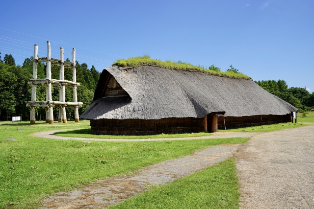 青森県青森市にある三内丸山遺跡は、縄文時代中期にあたる約5,000~4,200年前頃にかけての大規模な拠点集落跡であり、祭祀場を備えた顕著な集落遺跡です。遺跡は河岸段丘上に位置し、北側には竪穴建物や大型竪穴建物からなる居住域があり、東側には墓域が明確に区分されています。また、貯蔵施設や大型掘立柱建物跡、捨て場、盛土なども存在していました。大型掘立柱建物跡は、地面に穴を掘って柱を建てた建物の痕跡であり、柱穴は直径約2m、深さ約2m、間隔は4.2mありました。その中には直径約1mのクリの木柱が残っていました。地下水が豊富であったことに加え、木柱の表面と底を焦がすことで、腐らずに残っていたのです。これは6本柱によって支えられた長方形の大型高床建物であったと考えられています。また、遺跡からは多くの土偶やヒスイの大珠など祭祀用の道具類も出土しており、自然崇拝や先祖崇拝が継続して行われていたことがわかります。