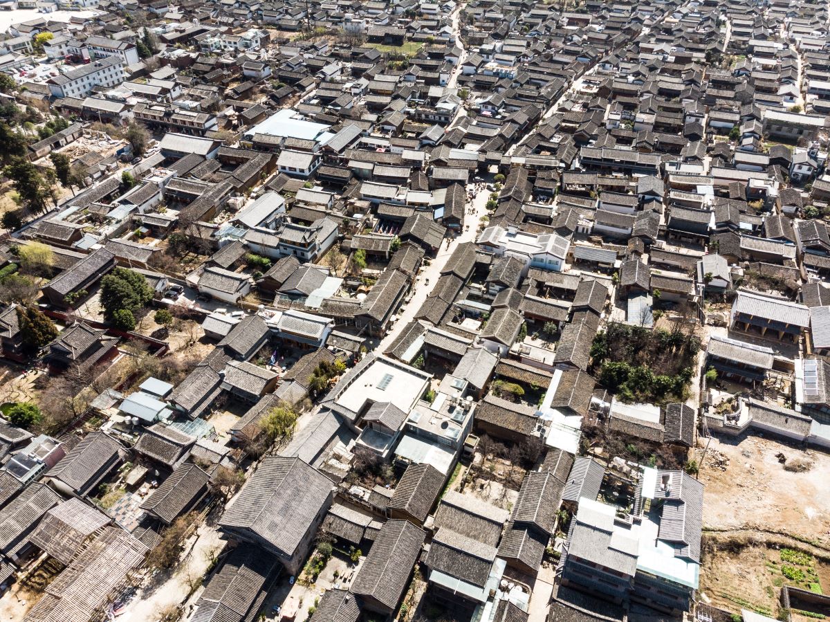 麗江は城壁がない石城として他に類を見ないものです。網の目のような石畳の道で覆われ、水路がめぐらされているこの街では、瓦葺きで2階建ての木造家屋が軒を連ねています。隙間なく立ち並ぶ民家は、古くから漢民族に伝わる「四合院」という中庭を建物でぐるりと囲む様式に工夫を加えた「四合五天井(しごうごてんじょう)」や「三坊一照壁(さんぼういっしょうへき)」といった伝統的な方法で建築されています。玉龍雪山の雪解け水は、旧市街の北側にある黒龍潭を通って街へと流れ込みます。水路には、明代につくられた2連アーチの大石橋などの石橋が架けられ、街路と水路の調和を担っています。