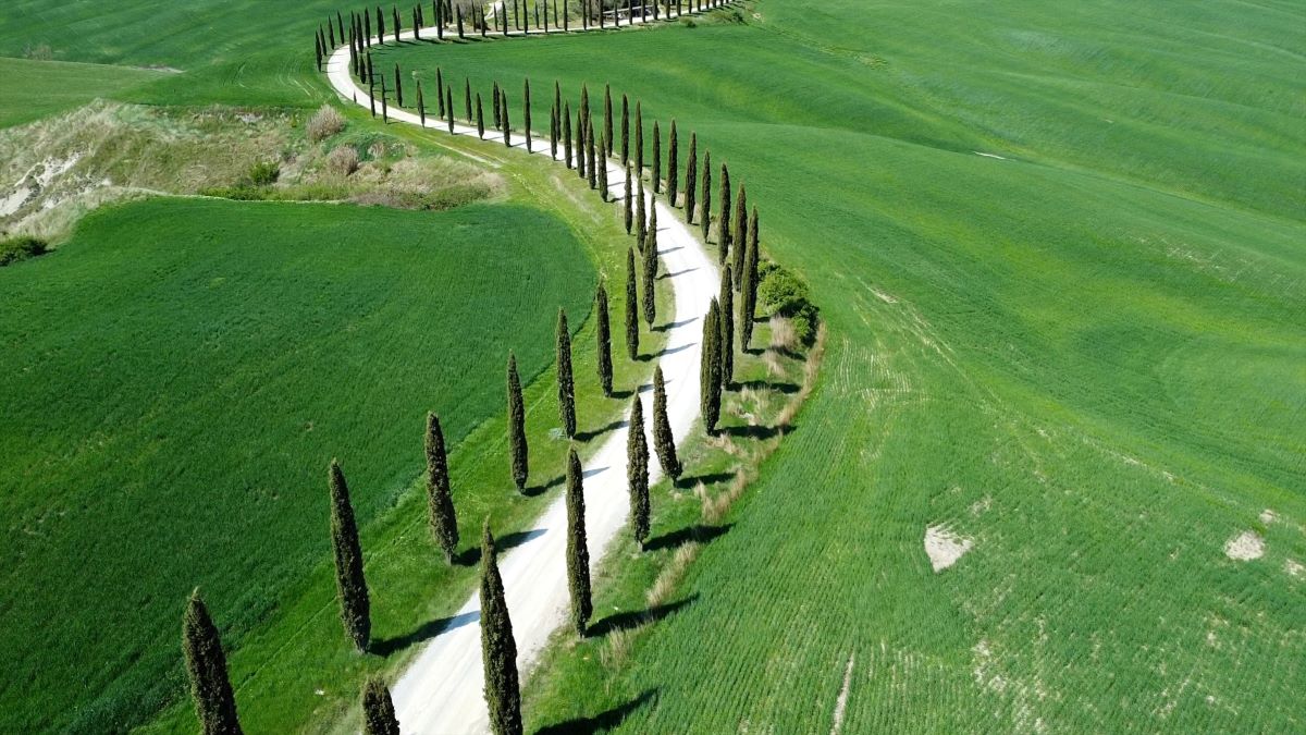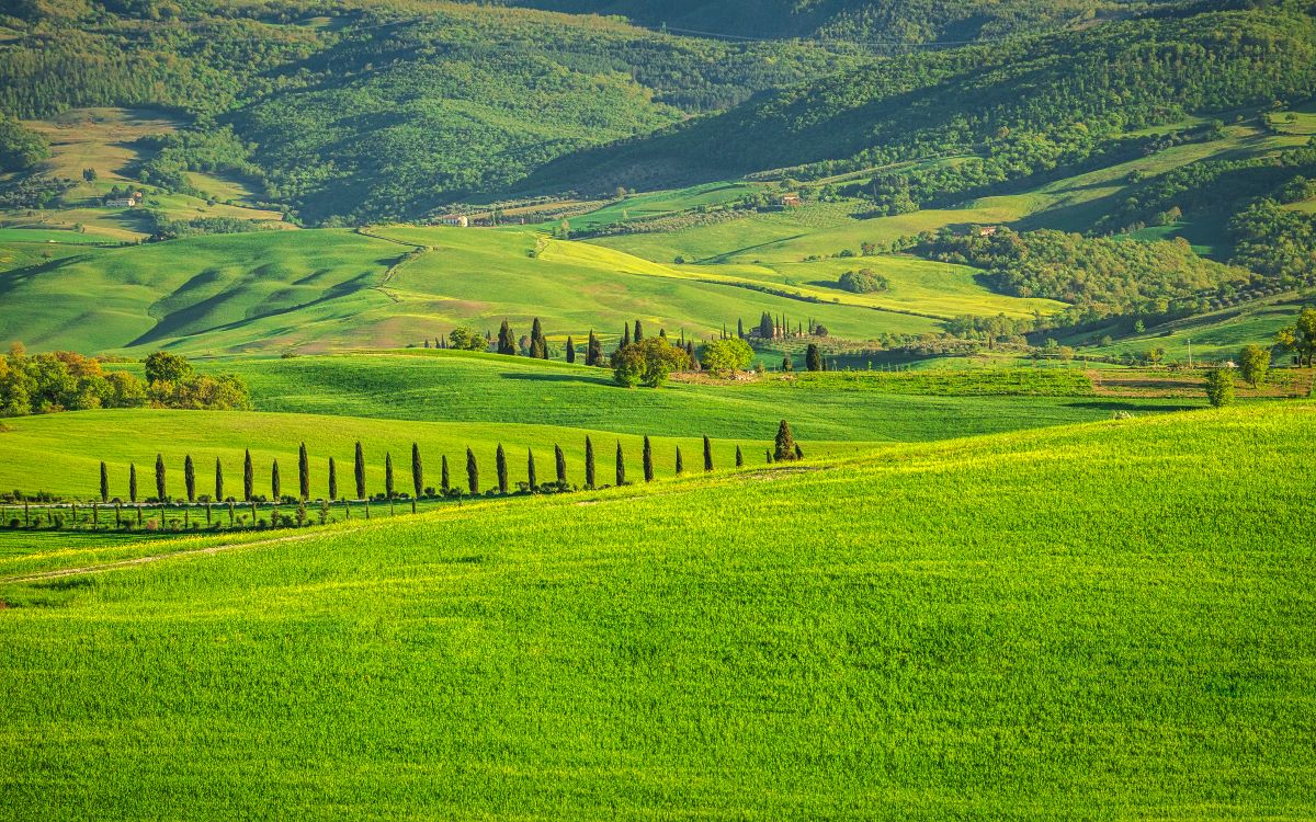 牧草、そして小麦畑の緑が一面に広がり、街道沿いには糸杉という畑の境界線の役目として植えられ、ブドウ農家や要塞、塔などが点在した美しい景観。しかしこの地域、もともとは純度の高い粘土質の土壌で、とても小麦やブドウ畑等には適していませんでした。大きな変化があったのは13~14世紀頃、都市国家シエナの発展により、シエナの裕福な商人がこぞって農業に参入し、オルチア渓谷は一大農地へと変貌していったのです。またその農村風景は芸術家たちのユートピアの象徴とされ、商人たちは芸術家への支援も惜しみませんでした。こうしてルネサンス期には絵画の題材としても使われ、まさに人の営みが芸術的にも優れた景観を生み出した傑作と言えます。