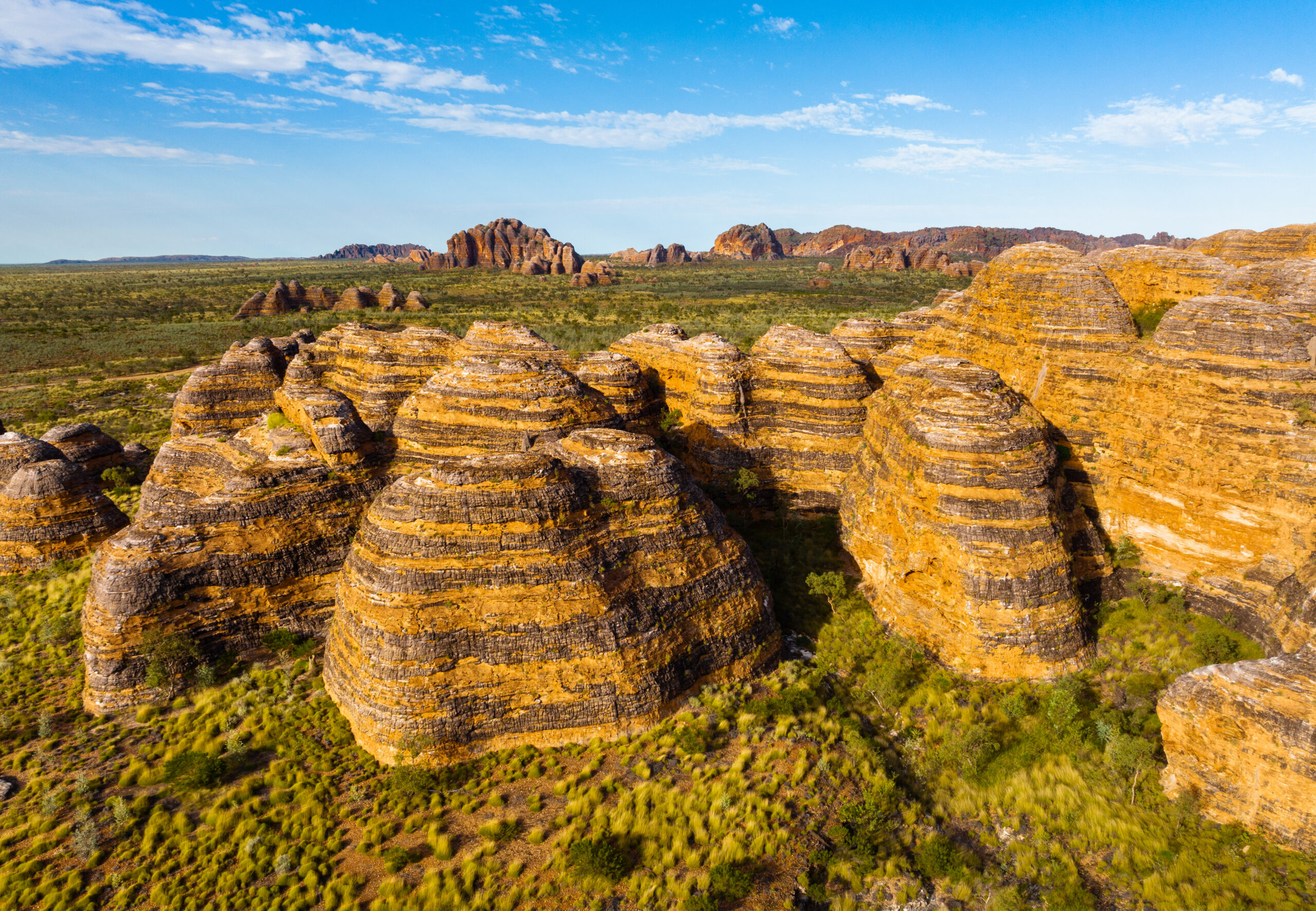 西オーストラリア州の北東端に近い地域に立地する約2,400㎢の規模を持つ自然保護区です。その立地からアクセスが比較的困難なため、わずか50年ほど前までは先住民などにしか知られていない秘境と呼ぶにふさわしい場所でしたが、その並外れた自然美で国際的に認知されるようになりました。公園中央に位置する「バングル・バングル」と呼ばれる奇岩はその象徴とも言えるもので、縞模様の蜂の巣のような形状を持つ円錐状の岩が立ち並ぶ光景が見られます。「バングル・バングル」とは現地のアボリジナルピープルの言葉で「砂岩」という意味を持ちます。シアノバクテリアの生物学的作用によって古代の砂岩層を安定させる独自の堆積作用と、2,000万年以上の年月をかけて浸食や風化作用によって削られた円錐カルストの地形が、黒とオレンジの縞模様を織りなす壮大な景観を生み出しています。他にも様々な形状を持つ奇岩や崖が多く点在しており、公園の砂岩カルスト地形はその形成過程を示すものとして地質学的に貴重な価値を持つ存在となっています。