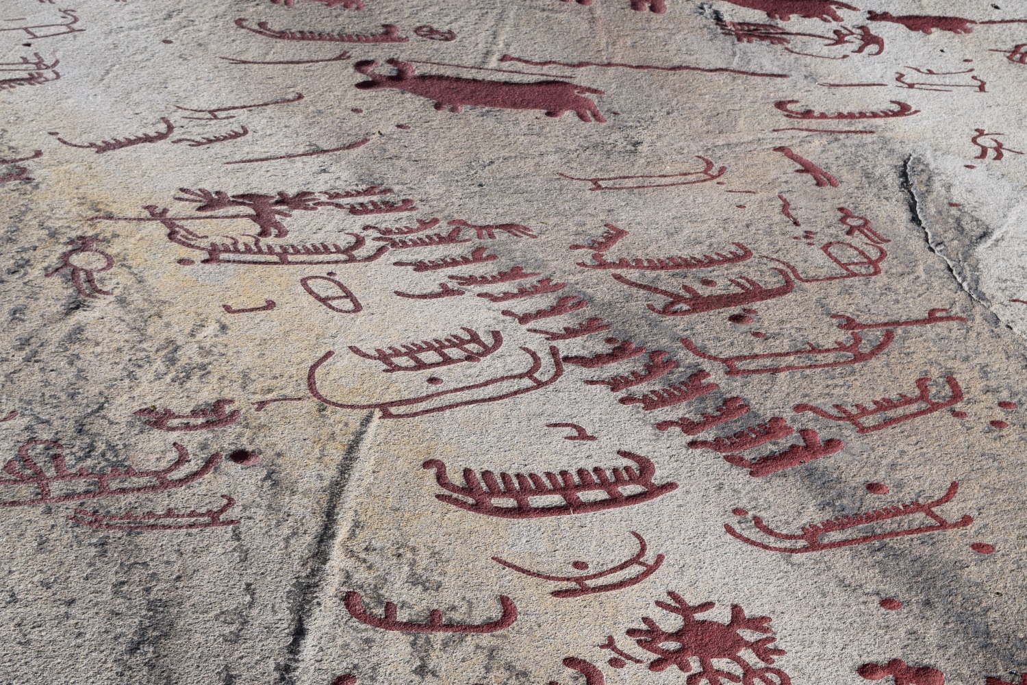 スウェーデン西部ブーヒュースレーン地方北部に位置するタヌムの岩絵群は、紀元前1500年~紀元前500年頃に描かれた青銅器時代の岩絵が残されています。この一帯は花こう岩の岩盤に覆われた土地で、氷河の浸食によって滑らかになった岩肌が岩絵のキャンバスとなりました。ブーヒュースレーン地方北部には1,500カ所以上の岩絵遺跡があり、その中でもタヌムには360以上に及ぶ岩絵が残っています。ノミや石鎚のような工具で岩肌を削り、そこに顔料で色を施された岩絵には人間、動物、船、武器、太陽などのモチーフが描かれており、スカンジナビアの先史時代の生活と文化を今に伝えています。